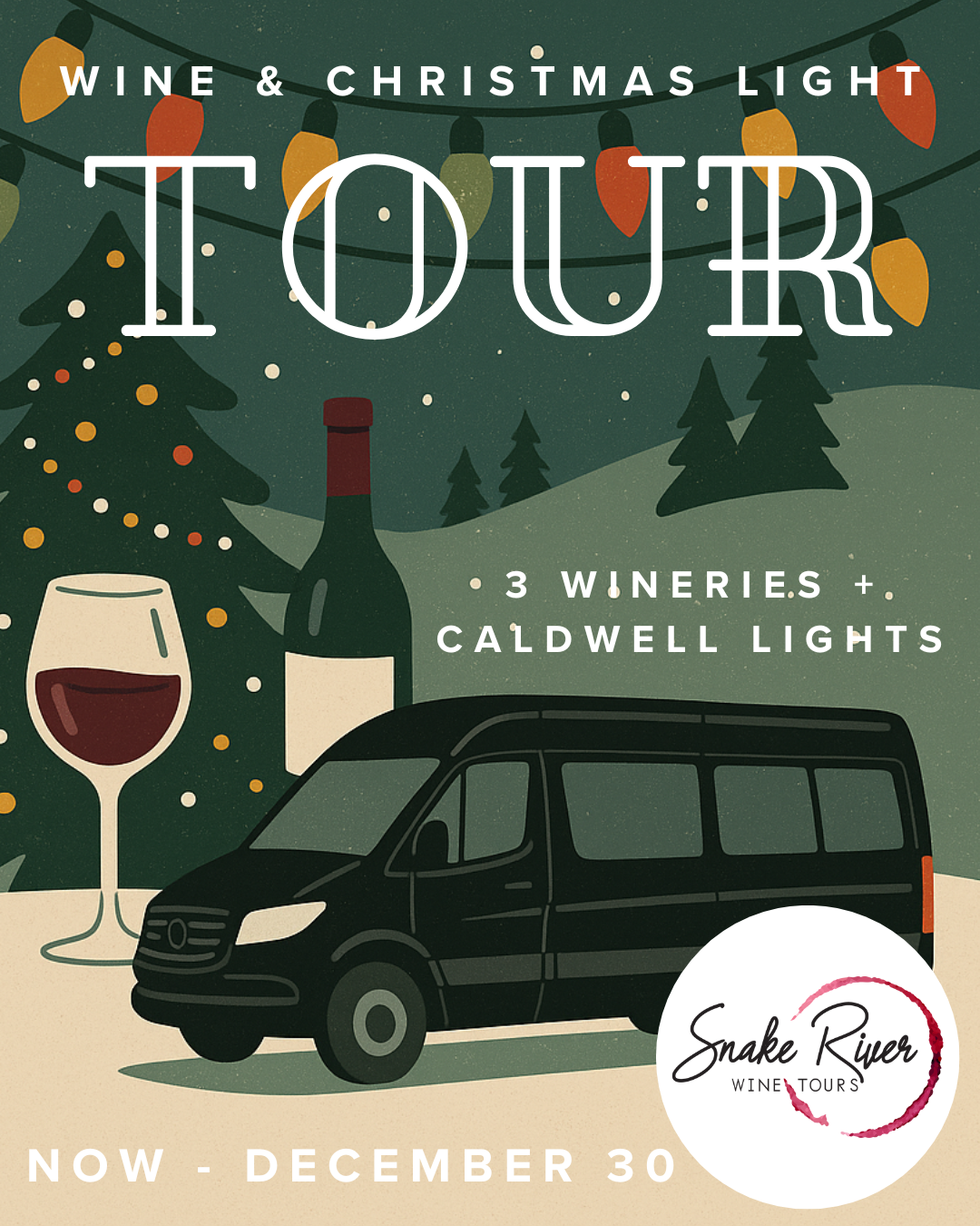 The holidays are here, and there’s no better way to celebrate than by pairing Idaho’s award-winning wines with one of the most magical light displays in the Treasure Valley. Snake River Wine Tours is excited to bring you our Wine & Christmas Light Tour, a limited-time seasonal experience running now through December 30. This unforgettable outing blends the charm of the Snake River Valley AVA with Caldwell’s famous Winter Wonderland Christmas Light Display, featuring more than one million twinkling lights illuminating downtown.